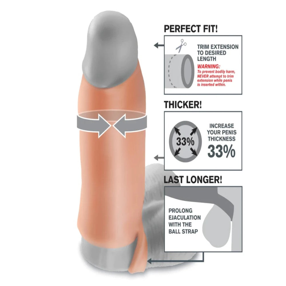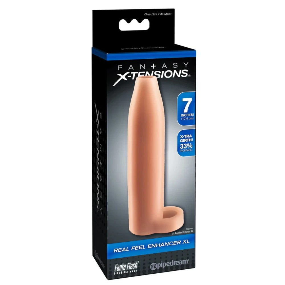 Real Feel Enhancer, mükemmel uyum için ucu kolayca kesilebilen, özelleştirilebilir bir kılıftır. Kalın geliştirici, açık uçlu bir başlığa sahiptir, böylece her hissi hissedebilir ve yine de sevgilinizin doğal dokunuşunun keyfini çıkarabilirsiniz. Çoğu bedene uyum sağlayacak kadar esnektir, daha uzun süre dayanmanıza yardımcı olacak kadar rahattır ve patlayıcı doruğa ulaşmak için boşalmayı uzatan bir top kayışına sahiptir. Süper yumuşak Fanta Flesh kol sizi %33 daha kalın hale getirerek sevgilinizi tatmin etmek için ihtiyacınız olan çevreyi ve güveni sağlar.
